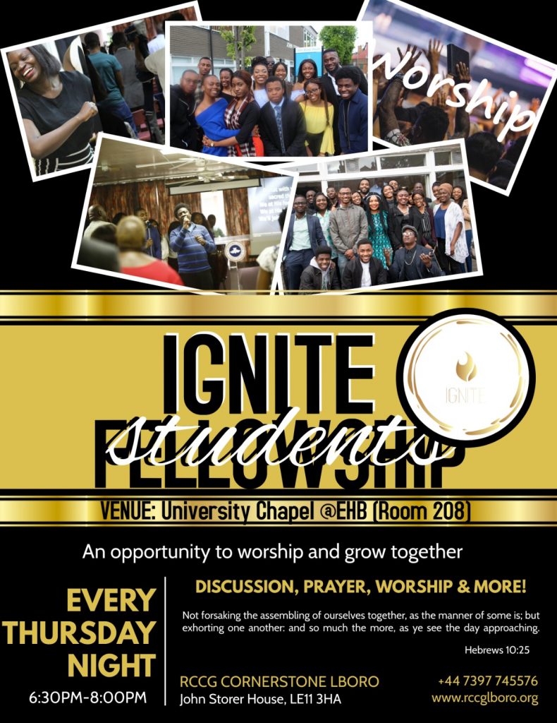 IGNITE is RCCG Loughborough's Young Adult Christian Fellowship and Campus Society at Loughborough University. We aim to set a fire our love for God and keep it burning through our weekly gatherings and events at Loughborough University's Chapel.